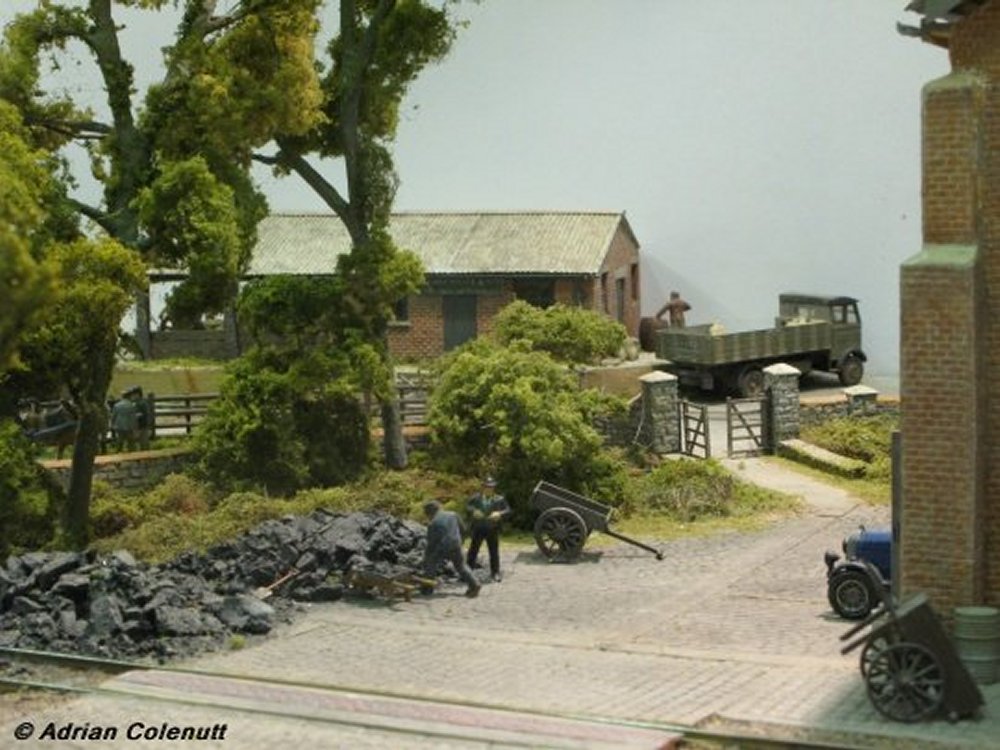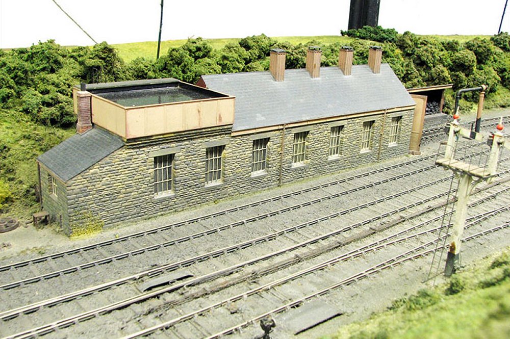 All the buildings and structures on the layout, with the exception of one SR platelayers hut (in the single line refuelling yard), are scratch built from cardboard. Some commercial modelling products have been used, such as the Ratio water tank and factory chimney, Plastruct girders, PECO wagon tanks, and occasionally plastic embossed roofing sheets, but the vast majority are made from card either covered with brick paper or simply painted with acrylics.