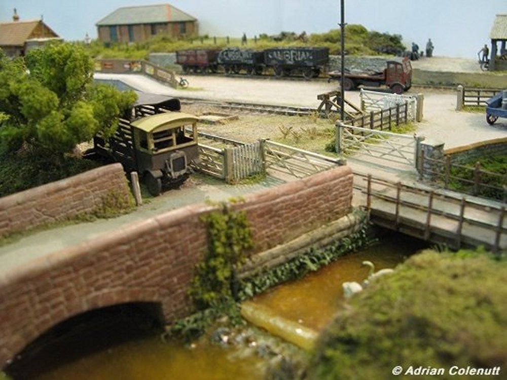 The layout packs a lot of detail and operating interest into just a 4ft by 2ft6inch and features an entire village bought from car boot sales and charity shops. The buildings are resin cast cottages sold as collectors items including 'Tetley Tea folk' houses. They are to slightly varying scales and are used to "force the perspective" on the layout by using the larger ones at the front and smaller ones at the back to increase perception of depth.