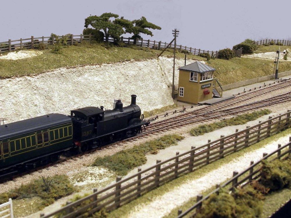 Trackwork is a mixture of scratch-built (ply sleepers and rivets and C&L cosmetic chairs) and C&L flexible lengths. The signals have been constructed largely from MSE components. Control of trains leaving the fiddleyard lies with the operators behind the scenic section of the layout, while trains moving to the fiddleyard are controlled by the fiddleyard operator.