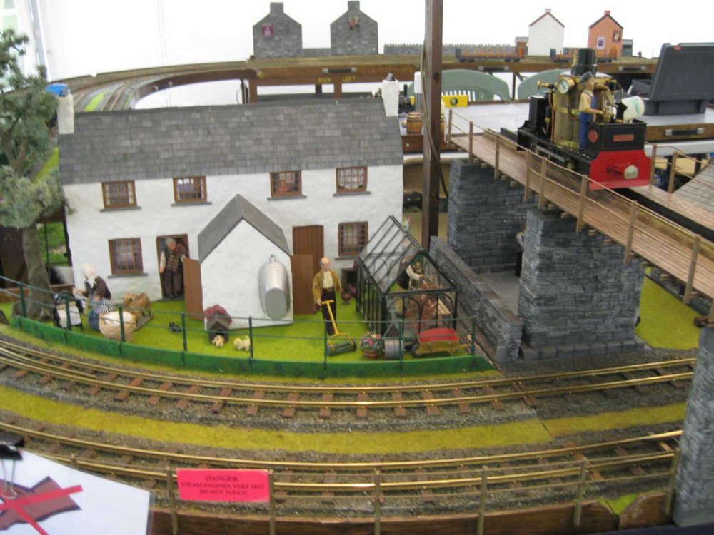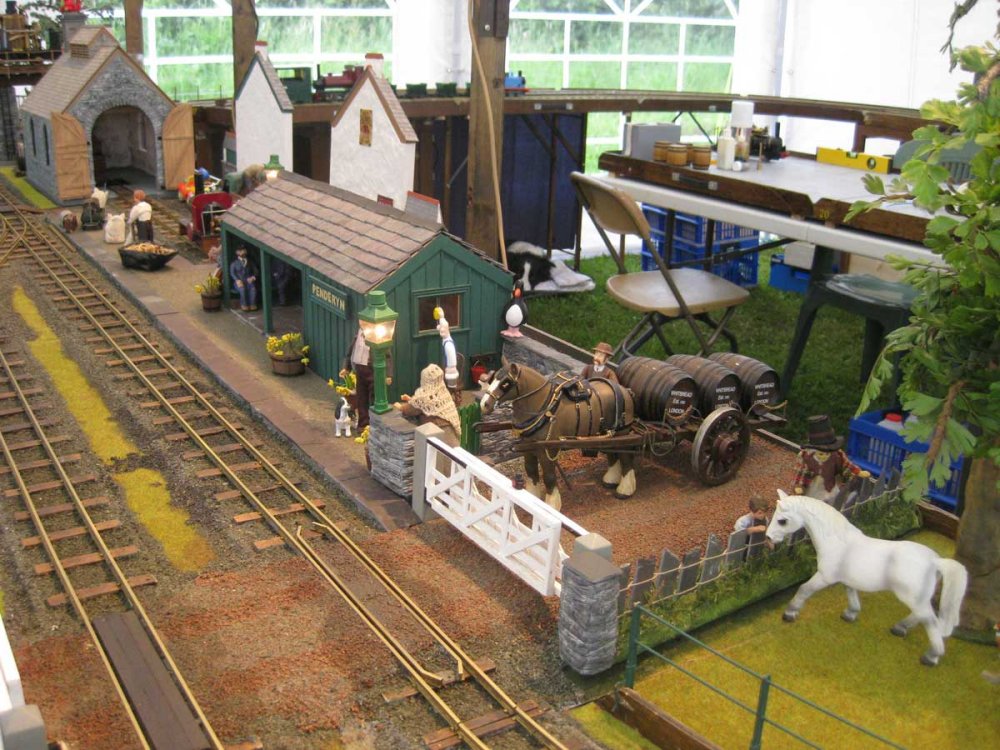 The current layout is a modular design that allows it to be erected in nine different sizes between 20ft x 8ft 6ins and 26ft x 14ft 6ins. All the track work is scratch built using brass flat bottomed rail pinned to wooden sleepers.There is an inner and outer running track and some of the points are connected together to make it a little easier to change from one track to another. All the buildings are scratch built and are based on structures seen on various Welsh narrow gauge railways. Most of the model locomotives that run on the layout are steam engines with a few battery powered electric ones that are used while the steam models are being serviced.