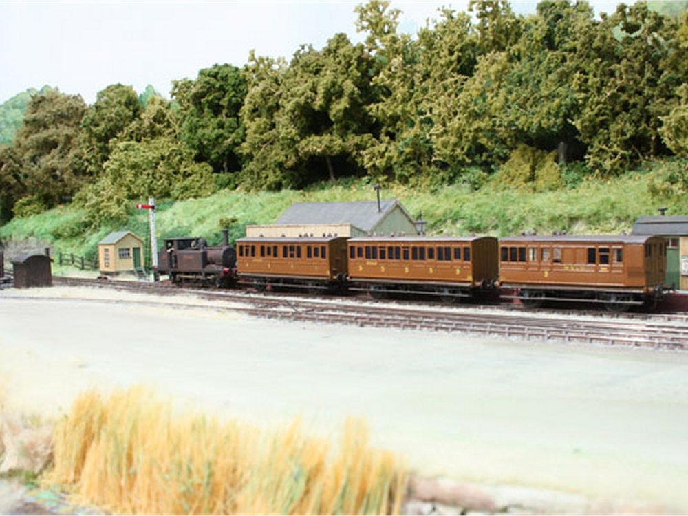 The locomotives and stock are built from etched brass or plastic kits with compensated chassis running on wheels and axles from Slaters.