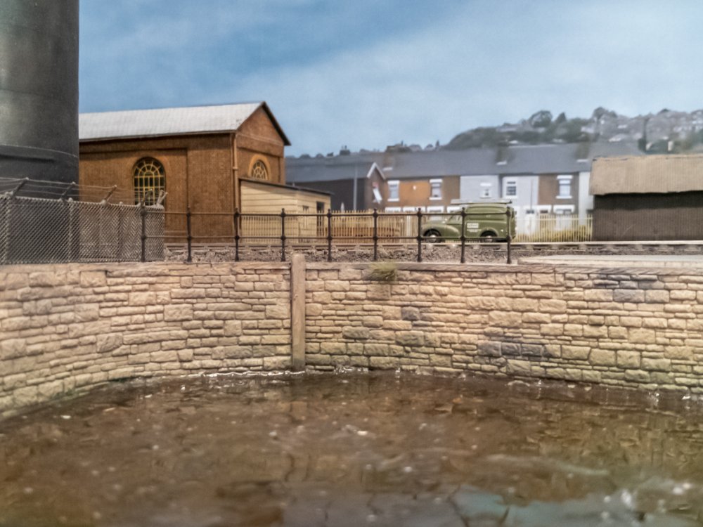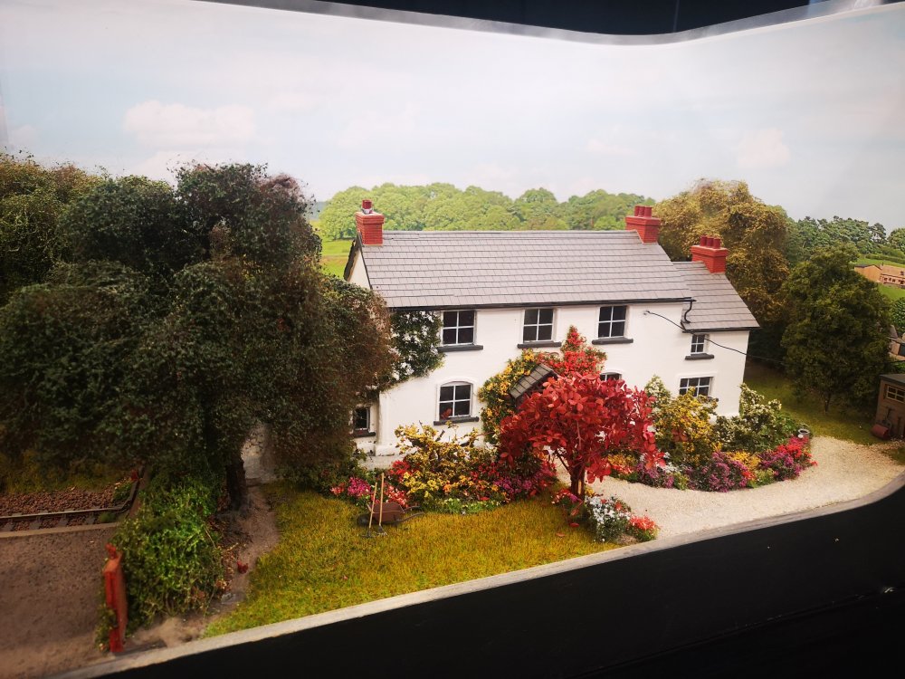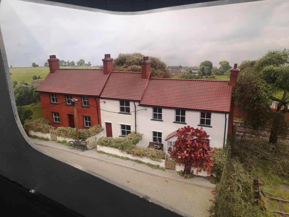 The buildings are resin cast cottages sold as collectors items including 'Tetley Tea folk' houses. They are to slightly varying scales and are used to "force the perspective" on the layout by using the larger ones at the front and smaller ones at the back to increase perception of depth.