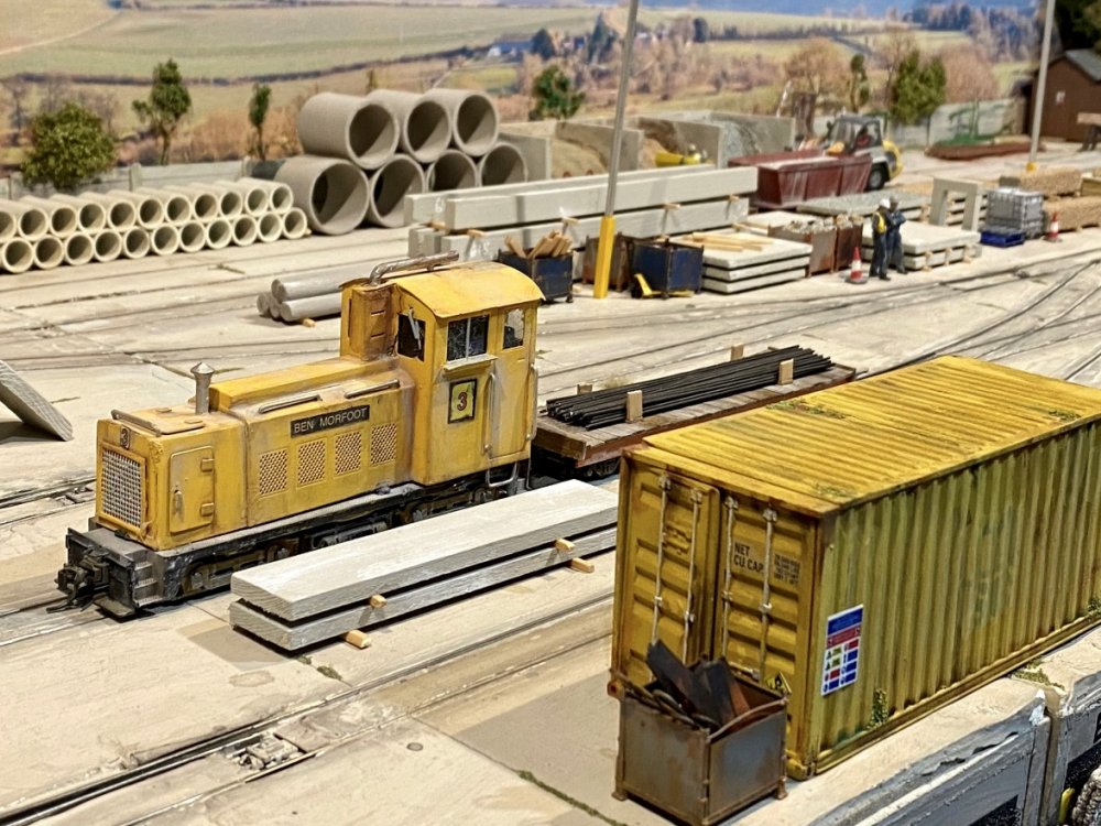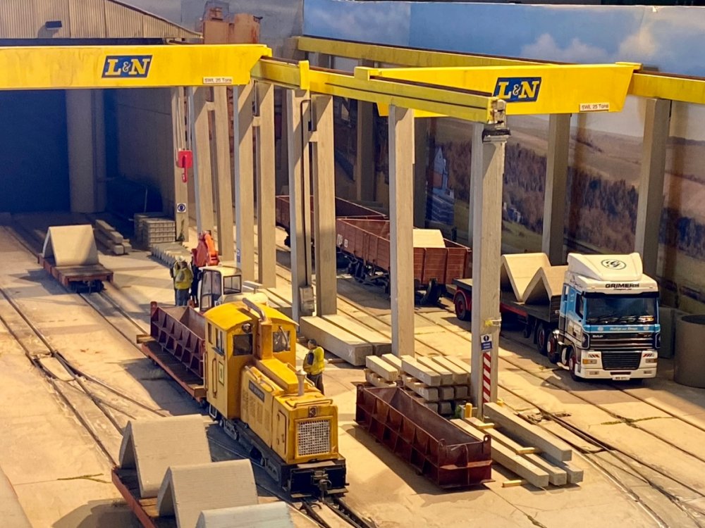 The layout is loosely based on the Tallington concrete works that is alongside the East Coast Main Line near Stamford. The works has been operated by Dowmac and Tarmac in the past, making concrete sleepers along with other concrete structures. They are now making tunnel sections for the new London Sewer.