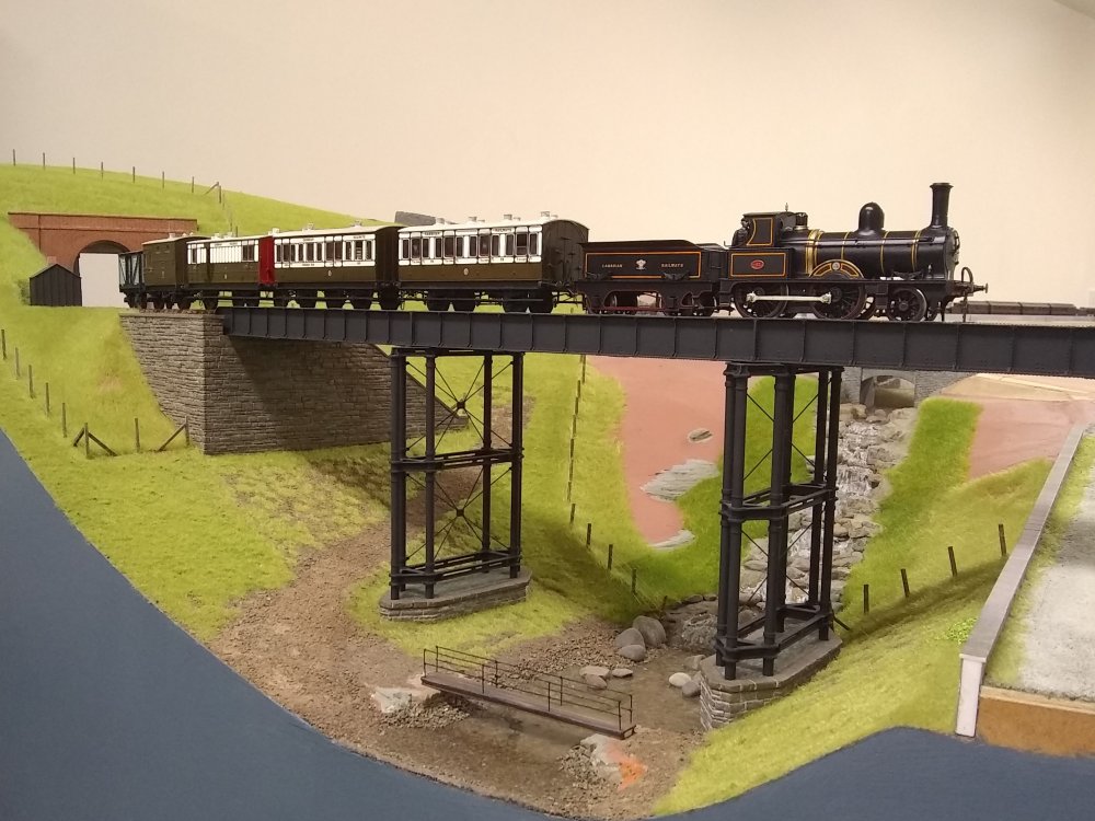 North towards Llanidloes there is even more modellers license although most of the structures are based on actual buildings along the line of the surrounding area. The chapel is that at Cwmbach, Glasbury and the mill and cottage are based on that at Llowes. The viaduct, designed by Benjamin Piercy still exists and now takes a minor road, the following portal is the south end of Rhayader tunnel.