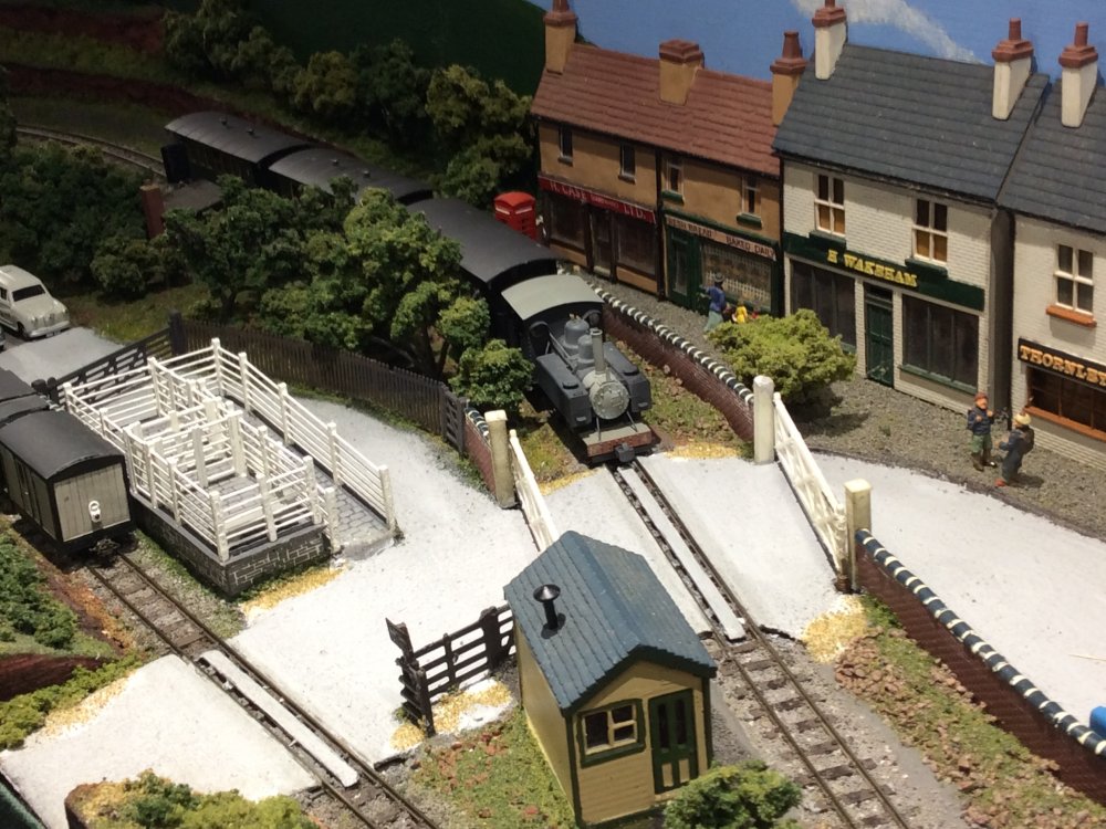The buildings are resin cast cottages sold as collectors items including 'Tetley Tea folk' houses. They are to slightly varying scales and are used to "force the perspective" on the layout by using the larger ones at the front and smaller ones at the back to increase perception of depth.