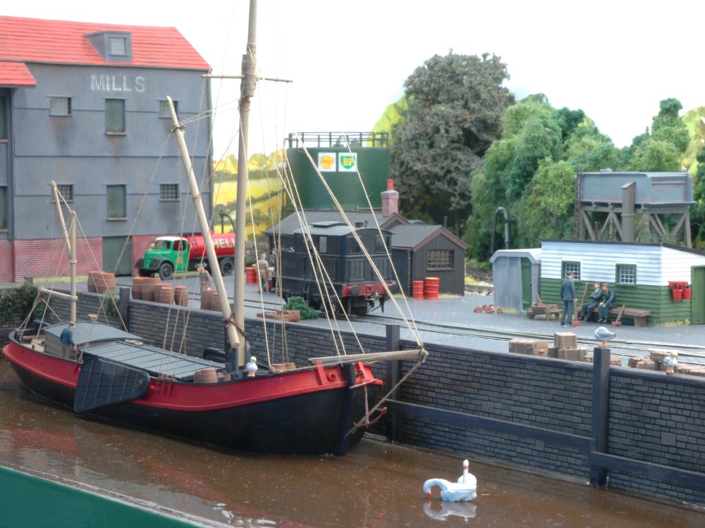 The trains from the main line enter Heybridge Wharf via the line between the Church and the gas works. This is the end of the line for the stock not allowed to proceed along the tramway to Heybridge Town. Those that are allowed will run round their train and proceed along the tramway squeezed between the gasworks and Colly Tobbold's brewery. The wharf still receives one of the last barges still trading but now converted with a diesel engine.